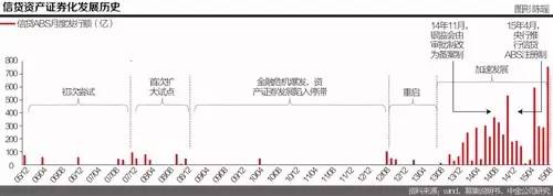 目前國(guó)內(nèi)ABS三種實(shí)現(xiàn)形式中,由央行和銀監(jiān)會(huì)統(tǒng)一協(xié)調(diào)監(jiān)管的金融機(jī)構(gòu)信貸資產(chǎn)證券化(發(fā)行人以銀行為主)發(fā)展最為成熟,市場(chǎng)規(guī)模也最大。中國(guó)的信貸資產(chǎn)證券化試點(diǎn)始于2005年,2007年下半年正當(dāng)信貸資產(chǎn)證券化試點(diǎn)擴(kuò)大時(shí),美國(guó)次貸危機(jī)爆發(fā),ABS遂被叫停。直到三年后才重啟。2014年11月,銀監(jiān)會(huì)推出信貸資產(chǎn)證券化備案制,2015年4月央行推行信貸ABS注冊(cè)制。