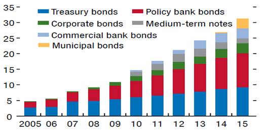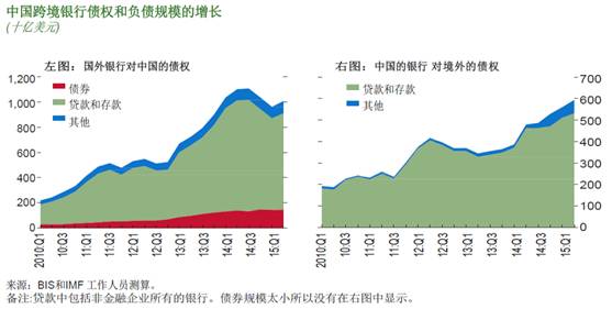 在過去五年中,跨境銀行業務的增長引人注目,如果保持這樣的增速,中國將成為全球主要的銀行業中心。銀行貸款是中國與世界其他地區建立金融聯系的主要渠道。2010-2015年,中國企業獲得的跨境銀行貸款規模增長了五倍,超過1萬億美元(圖4,左),并且中國的銀行向境外投放的貸款規模增加了三倍,達到近6000億美元(圖4,右)。未來,隨著更多的中國企業“走出去”,中國的銀行業務很有可能會緊跟其腳步。
