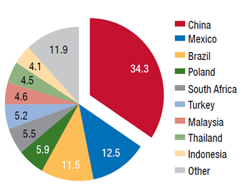 圖7 部分新興市場國家外國投資者持有的主權債比例(%)