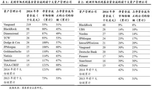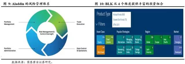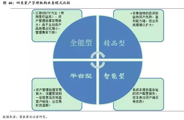序:資產(chǎn)配置的最迫切時代 隨著貨幣供給加速和中國居民財富積累,中國資產(chǎn)管理行業(yè)擁有近百萬億元規(guī)模。截至2015年底,包括銀行理財/信托/保險資管/券商資管/公募基金/基金子公司/私募基金等在內(nèi)的泛資產(chǎn)管理市場管理資產(chǎn)總規(guī)模達到約100萬億元人民幣。根據(jù)BCG預測,到2020年,中國泛資產(chǎn)管理市場管理資產(chǎn)總額預計達到174萬億元人民幣,2015至2020年均復合增長率可達13%;剔除通道業(yè)務(wù)之后,管理資產(chǎn)總額預計達到149萬億元人民幣,2015至2020年均復合增長率達到 17%。 資管規(guī)模增長的驅(qū)動力在于:宏觀經(jīng)濟穩(wěn)增長帶來的財富積累,人口老齡化促進向金融資產(chǎn)轉(zhuǎn)移,互聯(lián)網(wǎng)等帶來的技術(shù)創(chuàng)新。同時監(jiān)管政策環(huán)境下,銀行等金融機構(gòu)資產(chǎn)管理業(yè)務(wù)也在主動轉(zhuǎn)型。根據(jù)銀行團隊的研究,目前銀行理財業(yè)務(wù)與其說是賺取管理費的資產(chǎn)管理業(yè)務(wù),不如說是表外的存貸款業(yè)務(wù);當前監(jiān)管導向下,未來銀行有望設(shè)立資產(chǎn)管理子公司,回歸資產(chǎn)管理業(yè)務(wù)本源,這會擴張資產(chǎn)管理業(yè)務(wù)規(guī)模。此外,全球有近10萬億元以上資產(chǎn)處于負利率環(huán)境中,波動率加大,資金的全球配置需求也在顯著提升。 在美國,權(quán)益資產(chǎn)作為“牛長熊短”的資產(chǎn),對藍籌股Buy and Hold策略為資管相對合適的投資策略(參見西格爾《投資者的未來》中實證結(jié)果)。而在新興市場,個股波動率高,投資中樞波幅大,估值端常發(fā)生迅速拉升和崩塌,系統(tǒng)風險顯著。這種情況下,在新興市場單純持股并非最優(yōu)的財富管理策略,針對多類別資產(chǎn)的配置策略更具穩(wěn)定性。相關(guān)資產(chǎn)包括對股票、股權(quán)、債券、類現(xiàn)金、房地產(chǎn)、商品、藝術(shù)品等多類別產(chǎn)品的優(yōu)化配置。 我們本報告主要梳理美國基業(yè)長青的資產(chǎn)管理機構(gòu)發(fā)展歷程,并分析其成功的產(chǎn)品設(shè)計策略。當然南橘北枳,中國資產(chǎn)管理機構(gòu)的發(fā)展更依賴于對中國制度環(huán)境的認識和應變,我們的分析也是管中窺豹。 1.美國資管業(yè):格局集中/策略差異/技術(shù)智能 從行業(yè)屬性看,美國資管機構(gòu)體現(xiàn)了格局集中、策略差異、技術(shù)智能等主要三個特征。我們將對針對北美典型的資管機構(gòu)發(fā)展進行分析。 格局集中:美國擁有一大批全球資產(chǎn)規(guī)模最大的基金公司,包括Vangaurd,BlackRock等。據(jù)統(tǒng)計,從1995年到2012年,美國市場規(guī)模最大的5家資產(chǎn)管理公司市場份額從34%提高到了40%,前25的資產(chǎn)管理公司管理的市場份額達到73%。主要原因是大基金公司品牌大,渠道廣且產(chǎn)品線豐富。 策略差異:大型基金公司主要依靠ETF產(chǎn)品,即發(fā)行行業(yè)指數(shù)基金,精品型的資產(chǎn)管理機構(gòu)主要依靠特定的投資策略,如對宏觀對沖/不良債權(quán)/私募股權(quán)投資等有獨特策略;也有部分機構(gòu)放棄資產(chǎn)端而搶占流量端,這體現(xiàn)為在平臺上聚攏流量,同時提供配置ETF組合的服務(wù)。 邁向智能:美國的Wealthfront,Betterment開創(chuàng)了人工智能理財產(chǎn)品的先河,即通過優(yōu)化程序為客戶“量體裁衣”,設(shè)計組合配置策略;近年來美國大型資管機構(gòu)也在跟進,如資管巨頭Vanguard近年也在大力推進人工智能理財產(chǎn)品。 2.巨頭型:黑巖的崛起 隨手打開《中國證券報》、《經(jīng)濟觀察報》或類似的刊物,總是能發(fā)現(xiàn)許多分析師或經(jīng)濟學家在講話。他們背后都有一些非常顯赫的名字:GS,MS, ML, DB等等。如果只看這些刊物,我們很容易把這些名字理解為金融市場的主角,是它們決定了價格、成交量和一切走勢。但這不是事實,因為它們只是中介商。對外行而言,它們擁有一個氣派的名字:投資銀行(InvestmentBank),而內(nèi)行一般把它們稱為“經(jīng)紀商/自營商”(Broker/Dealer),這精辟地描述了它們的兩大功能:幫助客戶進行融資和交易,用自己的資本進行投資和投機。 ML, Citi和許多其他投資銀行沒有自己的投資管理部門,GS,MS和DB的投資管理規(guī)模大致在2000-5000億美元之間,聽起來挺嚇人的。但是很少有人聽說以下的名字:Fidelity擁有1.4萬億美元,StateStreet擁有1.2萬億美元,CapitalGroup擁有大約1萬億美元,Vanguard擁有8000億美元。以上任何一家都相當于三到四家頂級投資銀行的資產(chǎn)管理規(guī)模。所以,當中國私募基金挺進香港,聲稱要把GS和ML趕出去時,他們完全錯誤理解了金融市場的角色關(guān)系。他們不應該把經(jīng)紀人趕出去,因為經(jīng)紀人是為所有人提供服務(wù)的,否則市場無法運轉(zhuǎn)。 金融投資的10個謊言之:我們在報紙上看到的名字是金融市場的主角 ——以上文字摘錄自《人大經(jīng)濟論壇》 2.1.戰(zhàn)略:持續(xù)對外擴張的資管巨頭 作為全球最大的資產(chǎn)管理機構(gòu),Blackrock(譯為黑巖,簡稱BLK)的股權(quán)結(jié)構(gòu)較為分散,內(nèi)部股東持股比例僅有5%,機構(gòu)和共同基金持股比例占71%,但持股比例較為分散。 1988年Blackrock由拉里?芬克和蘇珊?瓦格納等8人建立。最初,芬克得到了全球最大私募黑石