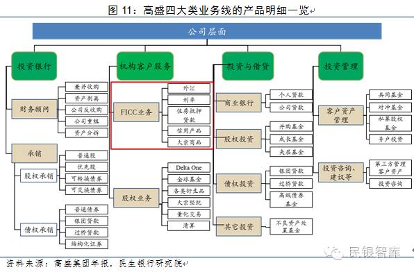 FICC業(yè)務對于現代投資銀行功能發(fā)揮的意義在于可以為不同類型的客戶提供流動性和風險管理功能,滿足客戶在利率、匯率、商品市場的多樣化投融資需求。高盛FICC業(yè)務主要是做市(market-making)業(yè)務,下設五條產品線,分別是:利率類(Interest rates)、證券化類(Mortgages)、貨幣/外匯類(Currencies)、信用類(Credit)以及商品類(Commodities)。