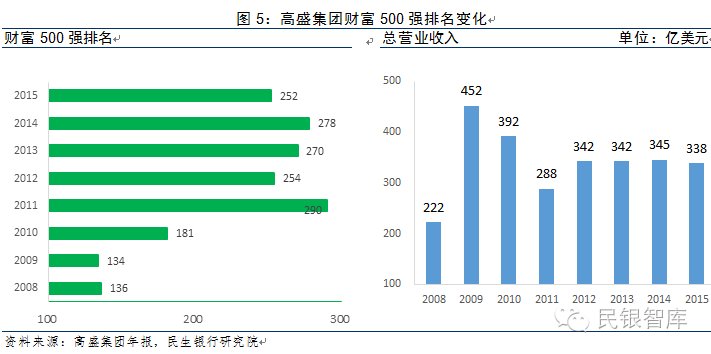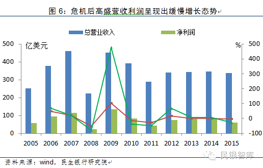 金融危機在很大程度上改變了國際投行業(yè)的發(fā)展軌跡。高盛集團的經營數據,也從側面表明全球投行業(yè)與全球經濟一樣正在經歷經濟低迷、調整和適應期。根據財富500強榜單(以總收入規(guī)模計),高盛2009-2016年排名有所下滑,但2011年后相對平穩(wěn)。