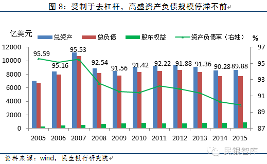 主動去杠桿。為滿足巴塞爾協議III等外部監(jiān)管的要求,控制經營風險,以美國投行為代表的金融機構都紛紛加速去杠桿,境外投行的經營杠桿都從危機前約30倍的水平下降至2015年約10倍左右的水平,其中高盛的杠桿比例從2007年高峰時期的26.2倍下降至2015年約10.3倍的水平。全美證券經營機構的杠桿比例從2007年高峰時期的38倍下降至2015年約18倍左右的水平。由于監(jiān)管發(fā)生了變化,高盛需要更多資金,以實現去杠桿化。從下圖可以看出,高盛通過內源積累和外源補充,資本金實力得以提升,“去杠桿化”成效顯著。