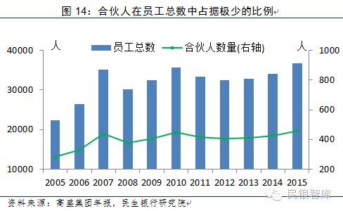高盛合伙人制度所具有的優(yōu)勢對股份制管理形成了有效補充:一是吸引優(yōu)秀人才長期穩(wěn)定為之工作;二是高級管理人員具有高風險意識與強責任意識;三是避免薪酬攀比以及帶來的內耗。高盛上市之后,它仍保留著合伙制的一些特點,例如合伙人仍然持有公司大量股份、并依據自己積累的客戶資源繼續(xù)給公司服務等等。上市后高盛的合伙人數量一直保持在員工總數的1.5%左右(2014年底的合伙人數量為467名),每兩年更新四分之一到三分之一。高盛每兩年會進行一次“合伙人才庫”的選拔。選拔將以員工的商業(yè)貢獻與文化適應性作為主要評選標準。成為合伙人才庫的會員不但享有優(yōu)越的紅利,而且還能把獲得的報酬投資于公司私營交易,并以低于市價的折扣買進高盛股票。合伙人頭銜并不附帶任何明確的責任,但是通常可以得到加薪,并參加一個特別的合伙人獎金池的分配。