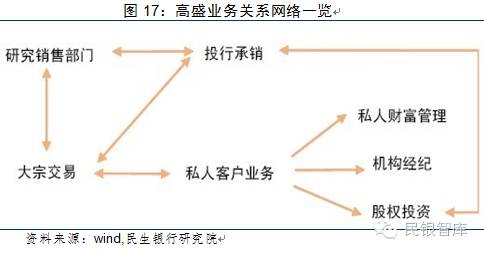 高盛的各項業(yè)務緊密聯系,環(huán)環(huán)相扣。通過與客戶的長期緊密聯系和經營管理,使得高盛的各項業(yè)務在合規(guī)的情況下彼此互通有無,能夠快速地了解客戶的需求并為之提供服務。比如投資銀行業(yè)務是高盛業(yè)務網絡的前沿,擁有廣泛的客戶網絡。高盛通過投行業(yè)務,與更多美國乃至全球最大的和聲望最高的公司建立了業(yè)務關系。高盛絕大多數直接投資業(yè)務機會都源自高盛的客戶網絡,客戶會選擇高盛在上市前擔任聯合投資者或合伙人,得以在上市時獲得更高的市場認可。而投行業(yè)務的快速發(fā)展進一步推動了高盛商業(yè)票據和賣方代理業(yè)務的拓展和升級,套利和大宗交易也蒸蒸日上。又如高盛重金打造的研究部門成為眾多機構投資者研究服務的最重要提供者,該部門在獲取強大盈利的同時為今后承銷業(yè)務的成功打下了客戶基礎。再如高盛私人客戶業(yè)務的快速發(fā)展又為其帶來了大量的投資銀行業(yè)務,私人客戶服務業(yè)務也成為高盛國際擴張戰(zhàn)略的關鍵部分。通過私人客戶服務業(yè)務,高盛產生了兩項重要的業(yè)務:私人財富管理和機構經紀業(yè)務。私人客戶業(yè)務幫助越來越多的企業(yè)家與高盛其他部門建立聯系,讓他們在享受高盛私人銀行專業(yè)服務之余,還得益于其在投資銀行業(yè)務和證券業(yè)務方面的專長。