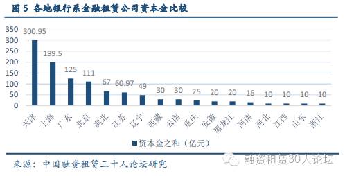 從資本金的角度看,北、上、廣、天津四地的銀行系資本金總和達736.45億元,占全國銀行系資本金總和的67%。其中,雖然天津與上海均擁有5家銀行系金租公司,在數量上并列位居第一;但在資本金的層面上,天津的銀行系金租公司資本金總和達300.95億元,比上海地區高出101.45億元。可見,相比起其他地區,天津無論從數量角度,還是資本金角度,都是名副其實的中國融資租賃聚集地。