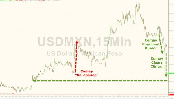 受“郵件門(mén)”調(diào)查重啟影響,特朗普支持率曾于11月1日反超希拉里,為自5月來(lái)首次。希拉里隨后再度追上,上周五的數(shù)據(jù)顯示希拉里以47%領(lǐng)先特朗普45%。 但就具體各州的選舉人票數(shù)而言,根據(jù)CNN綜合不同民調(diào)昨日發(fā)布的選情預(yù)測(cè)來(lái)看, 由于部分戰(zhàn)場(chǎng)州轉(zhuǎn)而支持特朗普,希拉里目前能“穩(wěn)拿”的選舉人票首次跌下270票大關(guān) ,為268票。但仍然高于特朗普的204票。 目前共有6個(gè)“搖擺州” 仍然選情膠著,共計(jì)66張選票。 不出意外的話(huà),希拉里只需拿下其中一個(gè)便可突破270票大關(guān)獲勝,而特朗普則需要拿下全部6個(gè)戰(zhàn)場(chǎng)州。 民調(diào)顯示兩人支持率膠著之時(shí),在完成檢查新發(fā)現(xiàn)的與民主黨總統(tǒng)候選人希拉里私人服務(wù)器相關(guān)的郵件之后,美國(guó)聯(lián)邦調(diào)查局(FBI)上周日(11月6日)表示仍然相信沒(méi)有理由指控希拉里。該結(jié)論消除了籠罩在希拉里競(jìng)選之路上的一片烏云 科米在信中稱(chēng),“FBI調(diào)查組一直在夜以繼日地處理和檢查來(lái)自一個(gè)設(shè)備的大量郵件,該設(shè)備與一起無(wú)關(guān)的刑事調(diào)查有聯(lián)系。在此過(guò)程中,我們檢查了希拉里擔(dān)任國(guó)務(wù)卿期間的所有通訊。我非常感謝,F(xiàn)BI的專(zhuān)業(yè)人員在如此短的時(shí)間內(nèi)完成了這樣大量的高品質(zhì)工作。”一名執(zhí)法機(jī)構(gòu)的消息人士稱(chēng),該結(jié)論暫時(shí)結(jié)束了FBI對(duì)于希拉里郵件門(mén)的調(diào)查。 希拉里競(jìng)選團(tuán)隊(duì)的媒體聯(lián)絡(luò)主管Jennifer Palmieri對(duì)記者表示,“我們很高興事情已經(jīng)解決。” Think Markets U.K. Ltd.首席市場(chǎng)分析師Naeem Aslam稱(chēng),所有劇情都是富于戲劇性的,然而,F(xiàn)BI局長(zhǎng)仍堅(jiān)持7月時(shí)相同的結(jié)論。這對(duì)偏好風(fēng)險(xiǎn)的投資者而言是個(gè)好消息。 這意味著,希拉里掃清了勝選的一大威脅。 受FBI宣布調(diào)查結(jié)束影響,周一(11月7日)亞市開(kāi)盤(pán),墨西哥比索盤(pán)跳漲,漲幅擴(kuò)大至2.5%,為10月10日以來(lái)最大盤(pán)中漲幅,現(xiàn)報(bào)18.5772。上周該貨幣因FBI重新調(diào)查郵件而下跌,因卷入其中的希拉里民調(diào)結(jié)果對(duì)于特朗普的領(lǐng)先優(yōu)勢(shì)減少。下圖可以清楚地看到,經(jīng)過(guò)FBI圍繞新郵件調(diào)查希拉里的事件發(fā)展,墨西哥比索如今已反彈至此事發(fā)生之前