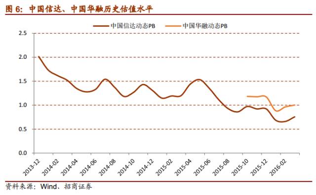 信達、華融不僅僅是從事不良資產管理的公司,多元化的步伐已經形成一個金融控股帝國。從凈資產構成來看,信達、華融不良資產經營業務的凈資產占比大約一半。相比較而言,華融更專注于資產管理業務,而信達更傾向于多元化,華融不良資產經營業務的凈資產占比56%,相比之下信達這一比例只有42.5%(去年8月25日,信達間接全資擁有的信達金控申請向中銀香港收購南洋商業銀行,2015年中期末南洋商業銀行凈資產為360億港幣,占信達凈資產1105億人民幣的27%,收購完成后信達不良資產經營業務的比例還要繼續降低),因而市場給予華融的估值也比信達更高(華融1.0x16PB,信達0.7x16PB)。