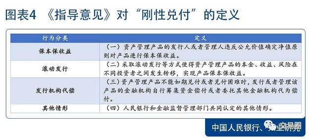 打破剛性兌付。《指導意見》首次明確定義了“剛性兌付”的概念(圖表4),規定了保本保收益、滾動發行、發行機構代償等行為將被認定為“剛性兌付”。