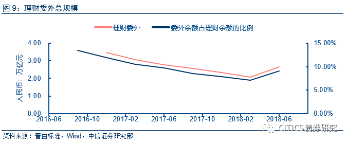 由圖9可以看出,理財委外規模和委外余額占理財余額比重自2016年底至2018年一季度末都處于下降通道,2018年二季度這兩項指標都有一定程度的反彈。但相較2016年末,理財委外規模已縮水約0.8萬億,縮水幅度為23.72%。