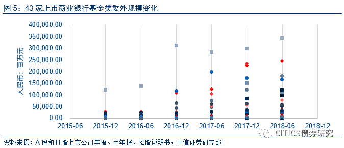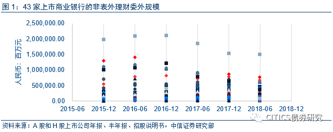 由于商業銀行僅在半年報和年報上披露“在第三方機構發起設立的結構化主體中享有的權益”這一數據,因此我們以半年為間隔,統計了2015年12月31日至2018年6月30日的所有在A股或H股上市的國內商業銀行共43家的非表外理財委外規模,如圖1所示。根據銀保監會的數據,截至2018年6月末,這43家上市商業銀行的總資產占所有商業銀行總資產的85.33%,因此這43家上市商業銀行在一定程度上代表了整個銀行業,我們可以將對其委外業務分析的結論外延至全銀行業。