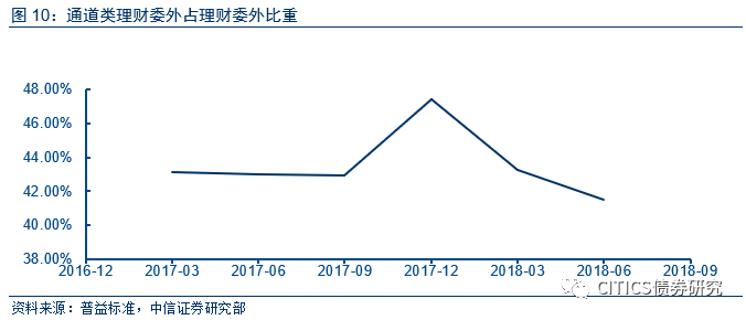 由圖10可以看出,自2017年第四季度以來,通道類理財委外占比持續下降,與通道類非表外理財委外占比的變化趨勢相同,這進一步說明了2018年以來的去通道監管政策是行之有效的。