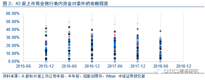 我們將43家上市商業銀行的非表外理財委外規模相加,來計算總的非表外理財委外規模及表內資金對委外的依賴程度,如圖3: