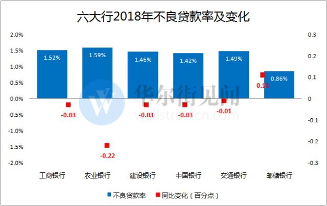 此外,郵儲銀行在2018年的不良資產(chǎn)率上升了0.11個百分點,其他五家銀行的不良資產(chǎn)率均有所下降,其中農(nóng)業(yè)銀行不良資產(chǎn)率下降0.22個百分點。