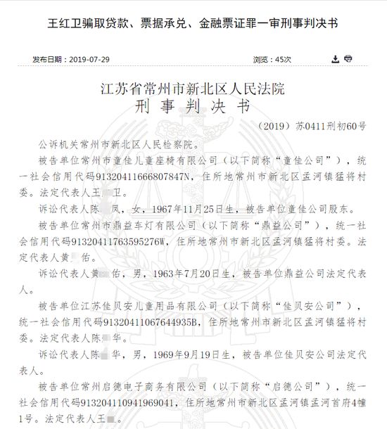 常州市童佳兒童座椅有限公司、常州市鼎益車燈有限公司、江蘇佳貝安兒童用品有限公司、常州啟德電子商務(wù)有限公司、常州百步電子商務(wù)有限公司因犯騙取貸款罪,分別被判處罰金50萬、30萬、30萬、10萬、5萬。