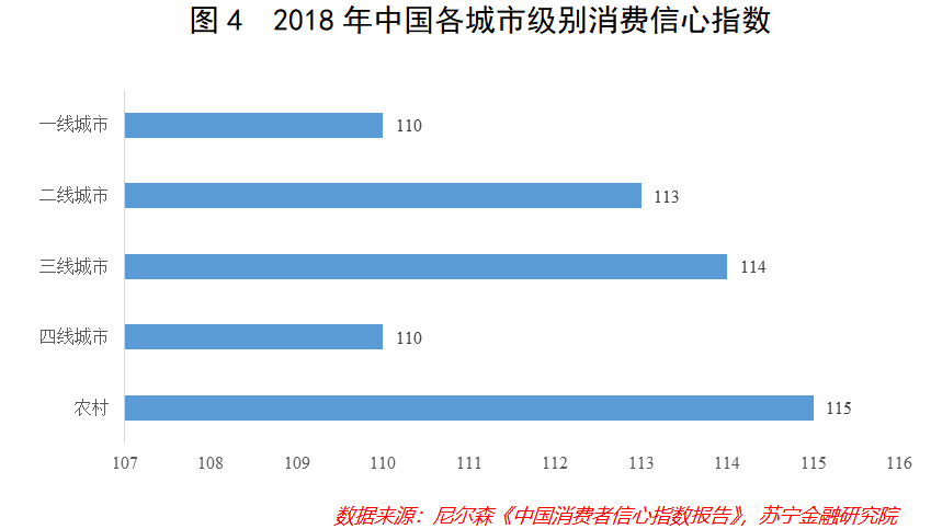 此外,低線城市和地區大多房價較低,相當一部分居民無需為巨額的房貸焦慮,從而擁有頗為旺盛的消費意愿,敢于花錢,甚至不輸那些每個月去了房貸就所剩無幾的一二線人群。尼爾森發布的《中國消費者信心指數報告》顯示,2018年,一線城市居民的消費信心是最弱的,而三線城市與農村居民的消費信心更加強烈(參見圖4)。