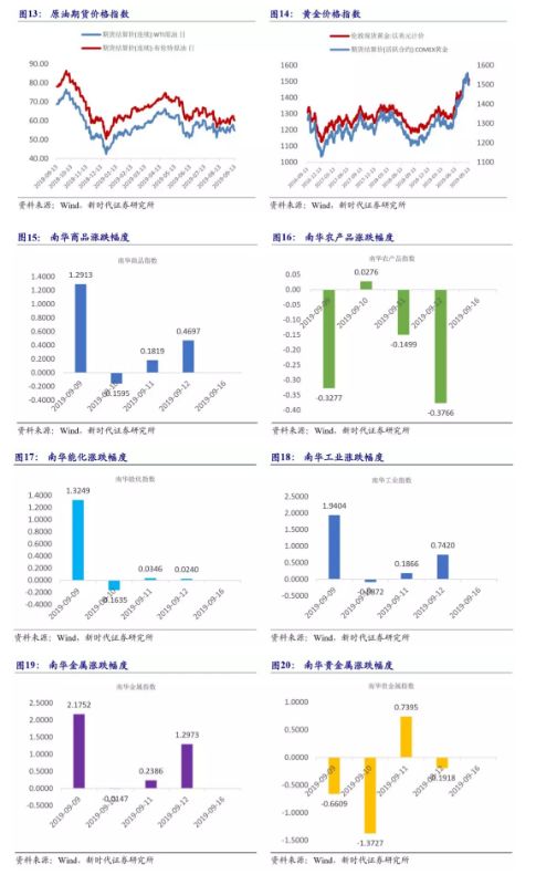 隨著避險情緒削弱,全球風險資產大漲,黃金價格連續回調,原油價格小幅下挫。上周,美國經濟數據向好,美債收益率攀升令貴金屬獲利回吐盤,中美貿易摩擦緩和,隨著避險情緒削弱,全球風險資產大漲,而避險資產遭拋,黃金避險需求遭到打壓,COMEX黃金期貨大跌1.31%,跌破1500美元/盎司,黃金價格一度跌至1499.50美元/盎司的三周低點,連跌三周。供給方面,沙特國有石油企業阿美的兩處主要石油設施遭到無人機攻擊,兩個石油設施已暫時停產,導致該公司削減約一半的總產量,約占世界每日石油產量的5%,對世界原油價格擾動因素增加;布倫特原油下行2.14%,報60.22美元/桶;WTI原油周跌2.95%,報54.85美元/桶。國內期貨品種黑色系漲幅居前,鐵礦石、螺紋鋼、焦炭、熱卷、玻璃繼續上漲,雞蛋、滬錫漲逾1%;能化品跌幅居前;水果期貨走低,貴金屬下行幅度較大。