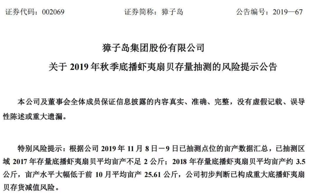 公司表示,根據目前已抽測點位的畝產數據匯總,已抽測區域 2017 年存量底播蝦夷扇貝平均畝產不足2公斤;2018 年存量底播蝦夷扇貝平均畝產約3.5公斤,畝產水平大幅低于前10月平均畝產25.61公斤。公司初步判斷已構成重大底播蝦夷扇貝存貨減值風險。