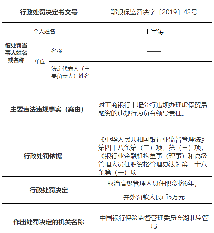又一組監管罰單來襲。上周五湖北銀保監局連發11張罰單,劍指工行湖北分行多家下轄支行的虛假貿易融資問題,工行湖北省分行、十堰市分行等兩級分行被罰380萬元,5名十堰分行工作人員與4名支行負責人被追究責任。