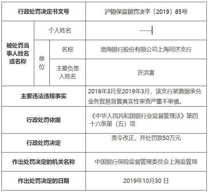 根據處罰,2018年3月至2019年3月,渤海銀行股份有限公司上海同濟支行某票據承兌業務貿易背景真實性審查嚴重不審慎。