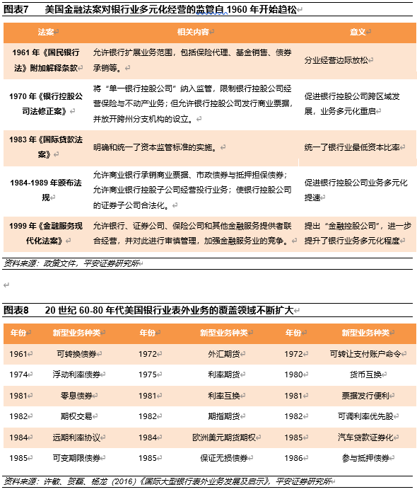 同期金融監管的趨松環境也為美國銀行業表外業務的快速發展提供了良機,銀行的分業經營逐漸轉為混業經營,銀行控股公司的發展也得到了法律支持。在這種背景下,美國銀行開始探索傳統業務之外具有較強盈利能力的金融業務,早在20世紀60年代就催生了表外業務。在20世紀60-80年代,可轉換債券、外匯期貨、利率期貨、貨幣互換、利率互換、期權交易、期指期貨等一大批金融創新業務不斷涌現,極大擴張了美國銀行表外業務的覆蓋范圍與規模,在這一階段,美國銀行業表外業務得到了快速持續的發展。