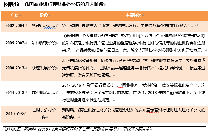 在此之前,我國商業銀行理財業務經歷了初步試水、積極探索、快速發展、轉型規范這四個階段。現如今,將迎來創建理財子公司的新階段。截至2019年11月,已有工行、農行、中行、建行、交行、招商、光大等七家商業銀行理財子公司開業運營,另還有五家正在獲批籌建,其他商業銀行也在積極申請成立理財子公司。2019年是名副其實的“商業銀行理財子公司元年”,我國資管行業也將迎來新的格局。