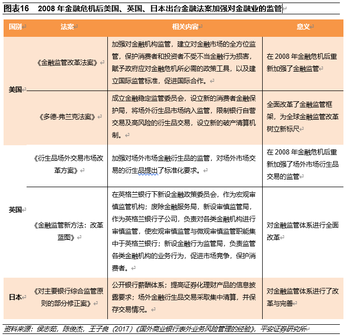 危機爆發后,美聯儲迅速持續降息至0.25%,美國政府也對房地美、房利美、貝爾斯登等金融機構進行了必要的援助或接管。除此之外,美國對金融監管體系進行了加強與完善,《多德-弗蘭克法案》的出臺加強了對包括資產證券化、衍生品交易等表外業務與信用評級機構的監管,著名的“沃克爾規則”要求商業銀行將傳統存貸與低風險中間業務和高風險表外業務分隔開,禁止商業銀行從事高風險的自營交易,并反對商業銀行擁有對沖基金和私人股權基金,限制商業銀行的規模以及衍生品交易資格。另外,美國還設立了金融穩定監督委員會進行宏觀審慎監管。英國、日本等發達經濟體也通過類似操作加強并完善了金融監管體系。