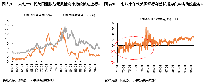 20世紀60年代中后期,美國通脹自1.0%的水平開始波動上行,一直持續至80年代初的14.8%;同期,美國十年期國債利率也呈現大幅上行走勢,自60年代中期的3.7%一路上行至80年代初期的15.8%。通脹與無風險利率的持續大幅攀升導致美國銀行吸引存款的成本急劇上行,而貸款利率在經濟周期波動頻繁和同業競爭壓力加強的背景下則需維持相對低位,這導致美國的銀行存貸款利差在60-80年代長期為負,給銀行傳統的存貸款業務的盈利情況帶來很大壓力。
