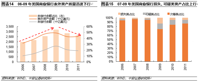2007年次貸危機爆發后,美國商業銀行信貸類表外資產未償付余額及其占表外資產比重均迅速上行,“可疑和損失”類占比不斷攀升的主要原因,說明其表外資產質量迅速下滑,表外業務受到極大沖擊。由于表外業務大多具有高杠桿屬性,且一系列新型表外金融產品將單個金融機構承擔的潛在風險分散至整個金融系統中,并層層嵌套,以至于市場參與者與監管層都很難在短時間內徹底理清這些產品的風險來源,這也是導致危機爆發前市場普遍缺乏風險意識、危機爆發后監管層難以迅速進行管控的原因所在。