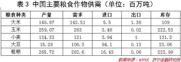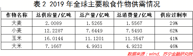 細分來看,全球主要糧食作物均供過于求(見表2),需求量最大的玉米供應過剩率超過40%,需求量第二大的小麥供應過剩率超過60%,也就是說,在全球完全無產量的情況下,全球各類的糧食儲備仍能滿足5.6個月的需求。