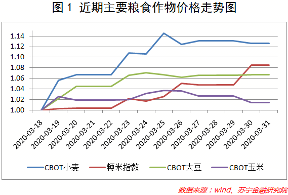 受新冠肺炎疫情的強烈沖擊,必要的生活、醫療物資供給全球趨緊,多個國家和地區出于糧食安全的考慮,逐步采取了糧食出口的限制(見表1),引發了全球關于糧食危機的憂慮。因為各國囤糧,近兩周主要糧食作物的價格均出現了不同程度的上漲(見圖1),其中小麥和大米價格的上漲幅度最為明顯。