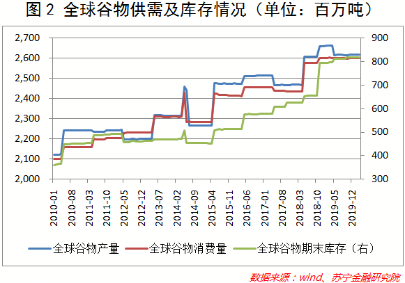 近年來,全球糧食的供給總體充裕,谷物庫存量持續走高(見圖2)。當前全球谷物供給量26.19億噸,超過全球谷物26億噸的需求量,2015年以來,谷物產量持續超過需求量;當前,全球累計庫存谷物8.17億噸,創千禧年來的新高。