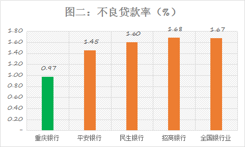 從圖中便可窺見,重慶銀行的不良貸款比例處于行業(yè)低位,且遠(yuǎn)低于1.67%的銀行業(yè)平均不良貸款率水平。