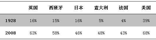 表1. 1928年和2008年房地產貸款占全部銀行貸款的比例