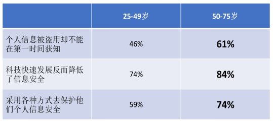 萬事達卡(Master Card)和摩根士丹利(Morgan Stanley)的調查報告印證了50后、60后對于保護個人信息安全的迫切需求。根據萬事達卡的調查,當調查人群被問到“未來三年是否會擔憂自己個人銀行信息被盜用”的時候,50后、60后給出肯定回答的人數是最多的(61%),而80后、90后是最不擔心這種情況的人群,只有45%的人表示了擔心。