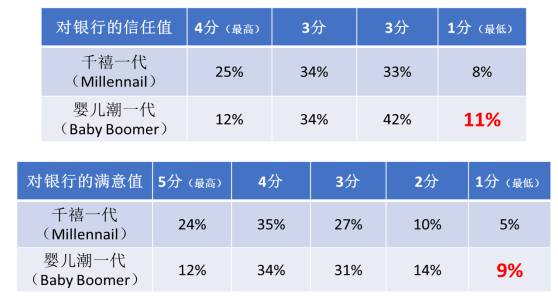 首先,行業普遍認為Baby Boomer是傳統金融機構的客戶,不會被輕易轉化。但是根據美國咨詢服務機構Gallup在2014年做的民意調查,Baby Boomer是在所有年齡層中對傳統金融機構最不滿意、最不信任的人群,即便他們當中89%的人擁有銀行賬戶(參見下圖)。