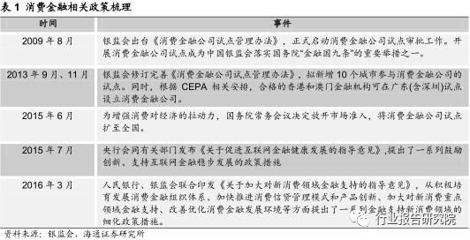 行業(yè)利好政策持續(xù)驅(qū)動。2009年7月銀監(jiān)會頒布《消費金融公司試點管理辦法》,首次為試點消費金融公司的準入、監(jiān)管和規(guī)范經(jīng)營提供重要的法律保障,隨后首批4家消費金融公司于2010年分別在北京、上海、成都和天津成立并于同年先后開始營業(yè)。