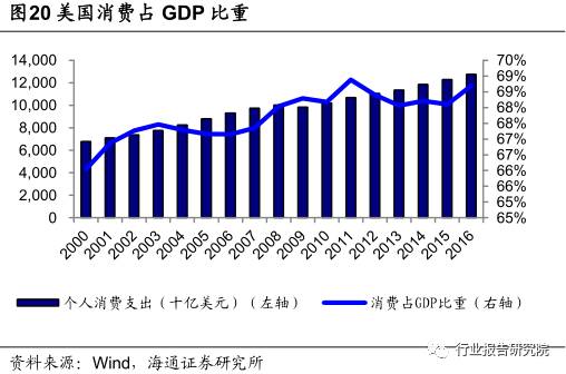 消費對GDP的貢獻逐年上升,仍有很大發(fā)展空間。 從經(jīng)濟發(fā)展規(guī)律來看,國家的經(jīng)濟發(fā)展最初主要依靠投資率推動,當經(jīng)濟發(fā)展到一定水平后,經(jīng)濟增長將由供給轉(zhuǎn)向需求,由投資拉動轉(zhuǎn)向消費驅(qū)動。