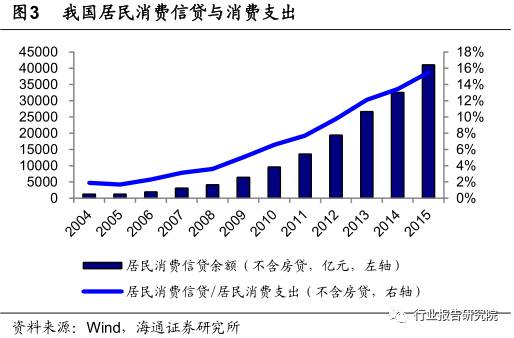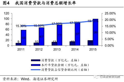 我們認為隨著人們消費觀念的進一步轉(zhuǎn)變和市場消費信貸產(chǎn)品的增加,消費金融將充分釋放強大的發(fā)展?jié)摿Α<僭O(shè)消費信貸按照每年20%的增速,2020年將達到12萬億,約占消費支出的25%,接近發(fā)達國家水平。
