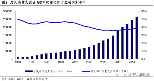 近幾年來,我國消費占GDP的比重持續(xù)增加,在2011年突破50%,我國已經(jīng)步入消費驅(qū)動型經(jīng)濟。2015年我國居民消費支出總額為26.48萬億元,同比增長9%,高于GDP的增長速度。