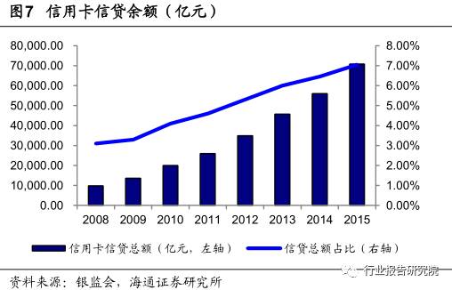 消費貸款在銀行的貸款總額中占比仍較低。截至2015年末,商業(yè)銀行個人消費貸款余額19萬億元,5年復(fù)合增長率17%,占貸款總額的比重由2011年的15%增長至19%;信用卡信貸余額7萬億元,5年復(fù)合增長率達到22%,占貸款總額的比重由2011的4%上升至7%。