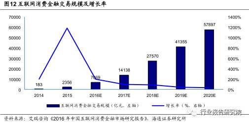 截至2015年,我國互聯(lián)網(wǎng)消費金融市場交易規(guī)模為2356.4億元,目前互聯(lián)網(wǎng)消費金融交易處于剛剛起步,增速非常快,2015年同比增長1187%。考慮到未來互聯(lián)網(wǎng)金融消費滲透率不斷提升,預(yù)計2020年有望達到5.7萬億。