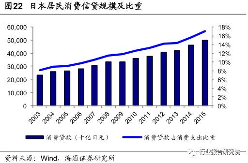 2016年不含房貸的消費信貸余額約為5萬億元,消費金融公司貸款約1000億元,互聯(lián)網(wǎng)消費金融約9000億,P2P消費信貸約410億,居民消費信貸總量預(yù)計達5.9萬億元,約占消費支出的19%,與日本較為接近,遠低于美國的30%。