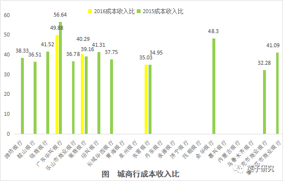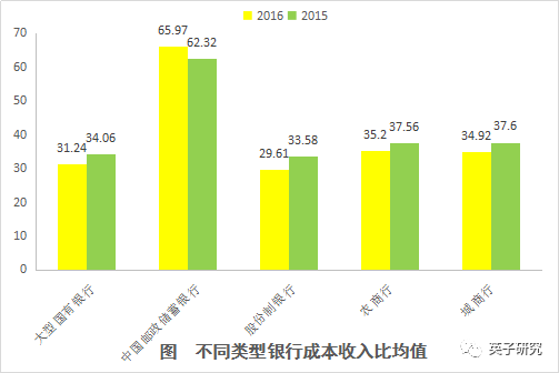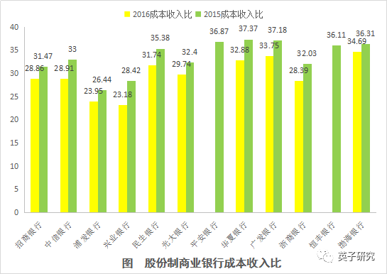 2016年度成本收入比范圍23.18%-34.69%,均值為29.61%;2015年度成本收入比范圍26.44%-37.37%,均值為33.58%。
