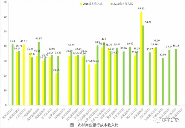 廣州農商行、常熟農商行、大連農商行,相比2015年度,2016年度成本收入比上升。大連農商行2016年度成本收入比高達63.32%。