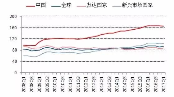 截止2017年一季度末,非金融企業負債占GDP的比重高達165.3%,不但顯著高于發達經濟體87.4%的平均水平,也顯著高于新興市場103.6%的平均水平,實體經濟存在“明斯基時刻”的隱患。