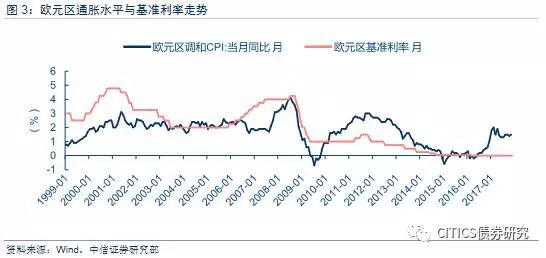 歐洲貨幣政策與經(jīng)濟(jì)周期的關(guān)系同樣存在類似變化。歐洲央行以穩(wěn)定物價(jià)為首要目標(biāo),基準(zhǔn)利率的調(diào)整與通脹波動具有較高同步性。2008年前,基準(zhǔn)利率始終高于通脹水平,但利率水平始終保持與通脹同向變動,通脹高企后基準(zhǔn)利率或相應(yīng)向上調(diào)整,通脹下行后基準(zhǔn)利率隨即下調(diào),調(diào)和CPI長期保持在2%左右;2008年后,歐洲采取寬松的貨幣政策,基準(zhǔn)利率明顯低于通脹水平時仍然繼續(xù)降息,托底經(jīng)濟(jì)的意圖明顯。2017年10月歐洲央行宣布逐步退出QE,而通脹水平仍然處于“1時代”。