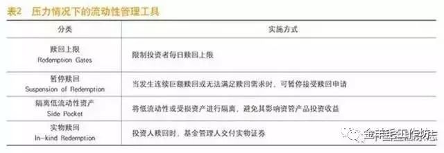 二是加強壓力情況下的流動性風險管理。監管部門應當要求資管機構進一步完善贖回上限、暫停贖回、隔離低流動性資產、采用實物贖回等臨時性流動性管理工具(見表2),明確使用條件和決策程序,并在使用過程中與投資者和監管部門充分溝通,盡可能降低使用臨時性流動性管理工具的障礙和負面影響。必要時,監管部門可以強制要求資管機構使用暫停贖回等臨時性措施,防止風險的進一步傳播擴散。