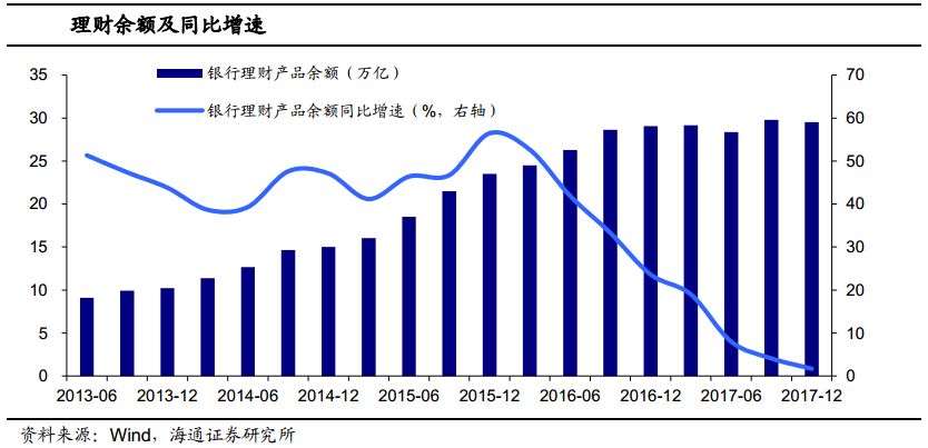17年理財年報公布,從規模來看,截至17年底理財規模為29.54萬億,較16年底小幅增長4900億,較17年6月增長1.16萬億,但同比增速大降至1.69%,再創歷史新低。