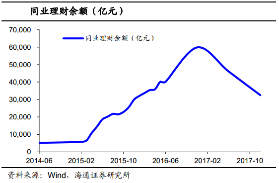 同業理財大幅收縮。17年以來,同業理財的規模出現大幅下降,也是導致理財規模同比增速下滑的主要原因之一。具體來說,截至2017年底,同業理財余額3.25萬億,相比年初大幅下降3.4萬億;占理財余額的比重為11%,相比年初也下降了11.88個百分點,規模與占比呈現雙降。值得注意的是,17年理財年報的“金融同業類產品”指面向銀行、證券、保險等金融機構銷售的理財產品,而此前16年理財年報的“銀行同業類產品”是指專門面向銀行同業發行的、由其他銀行表內資金購買的理財產品。